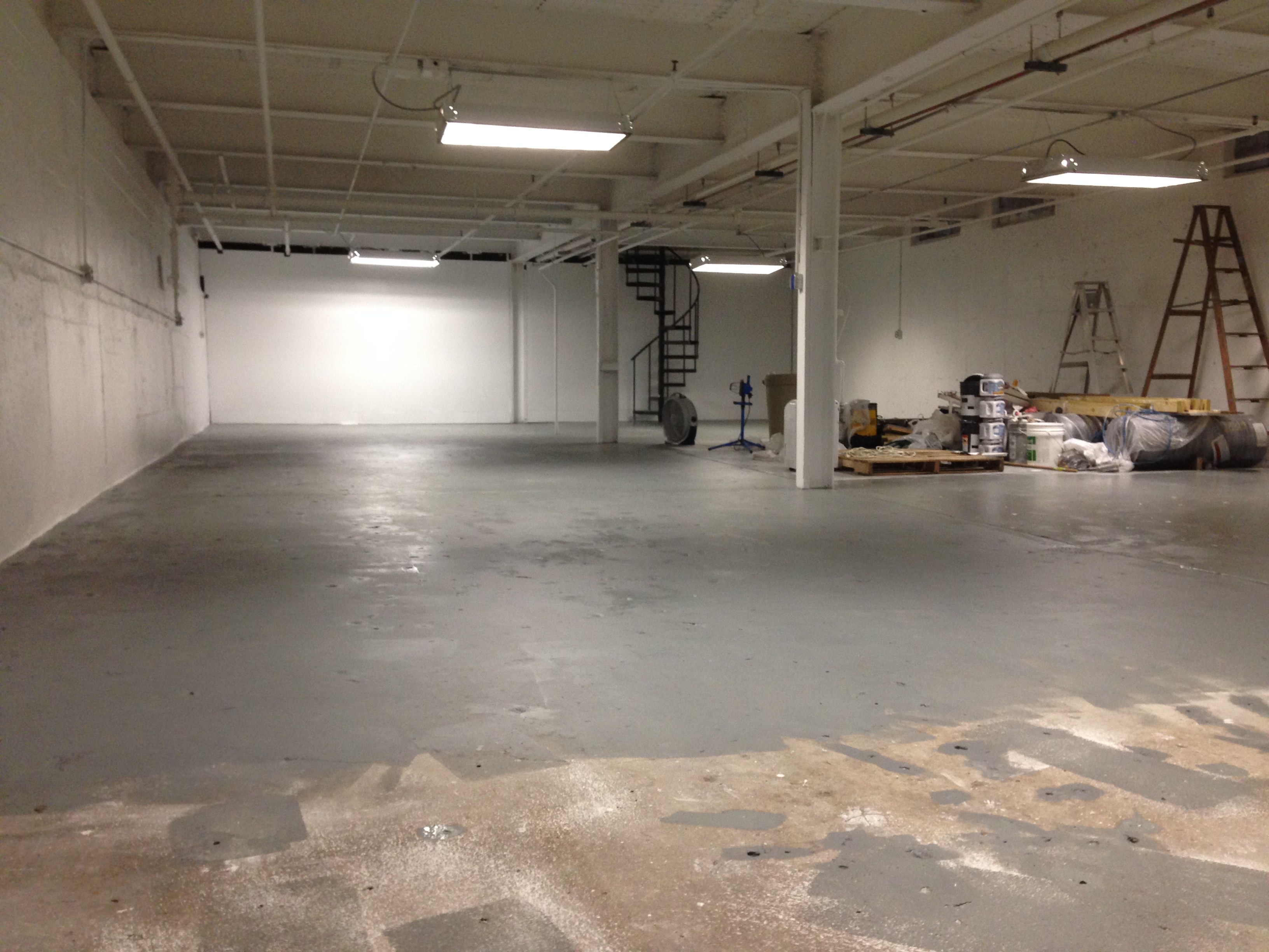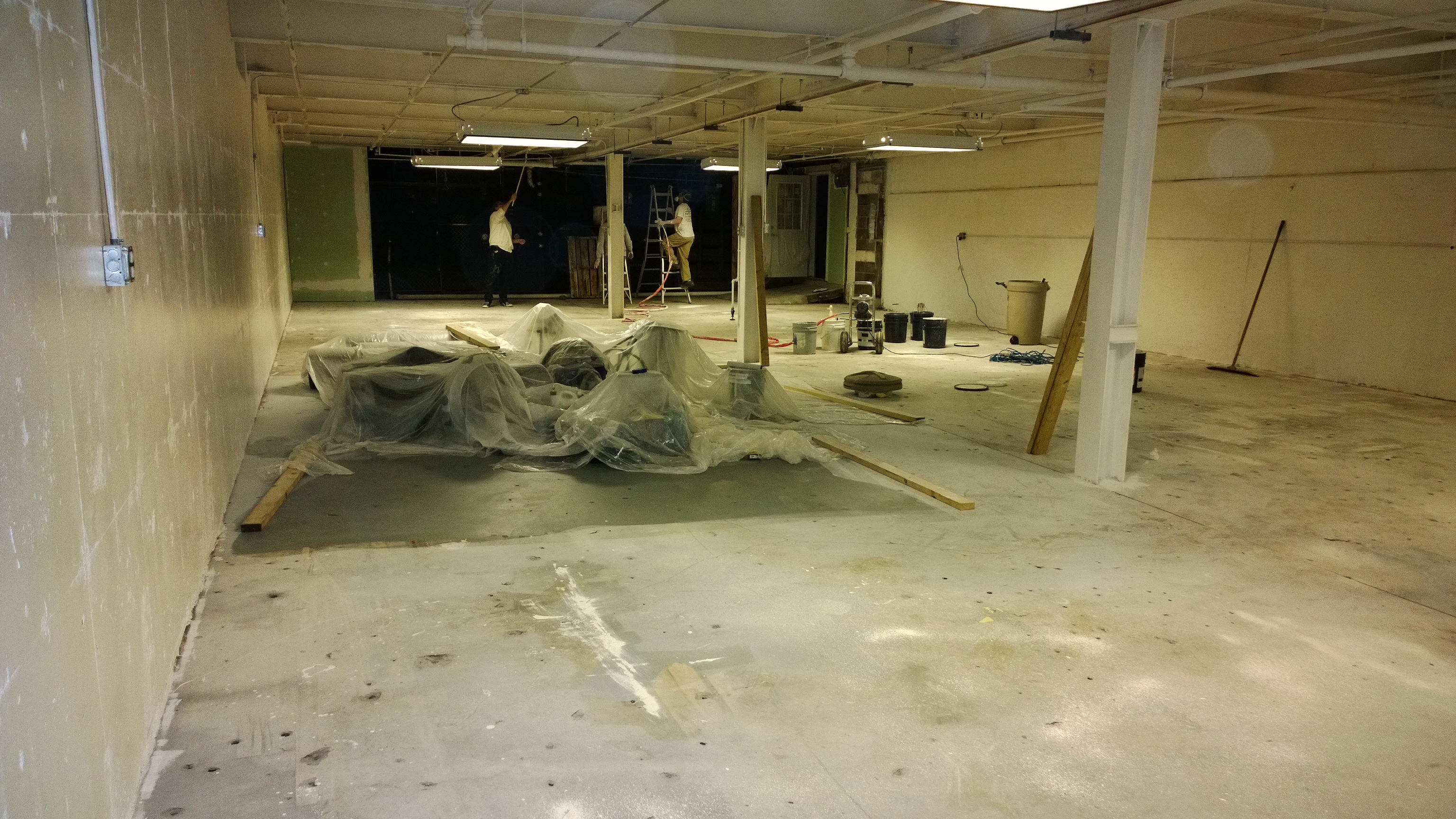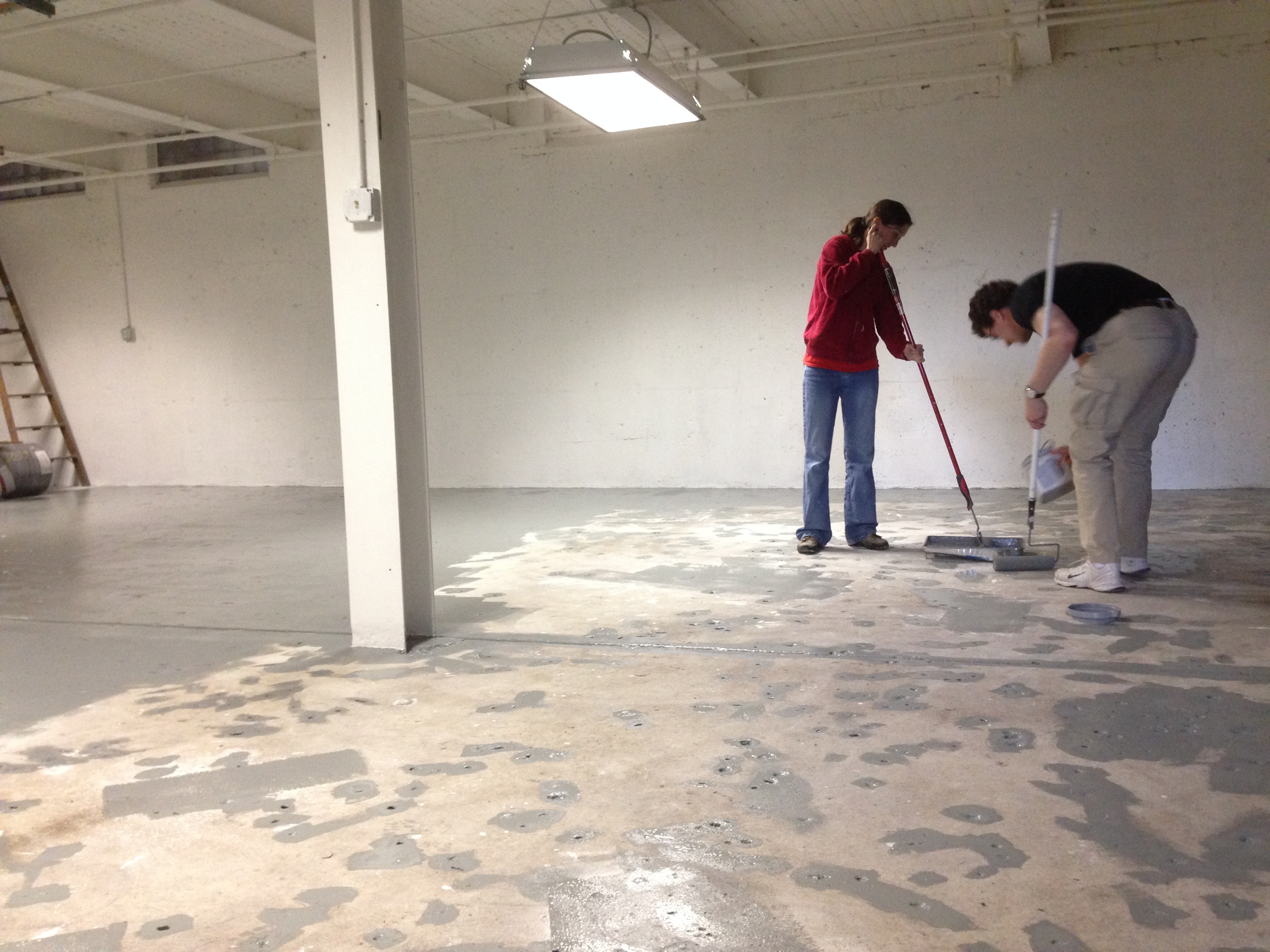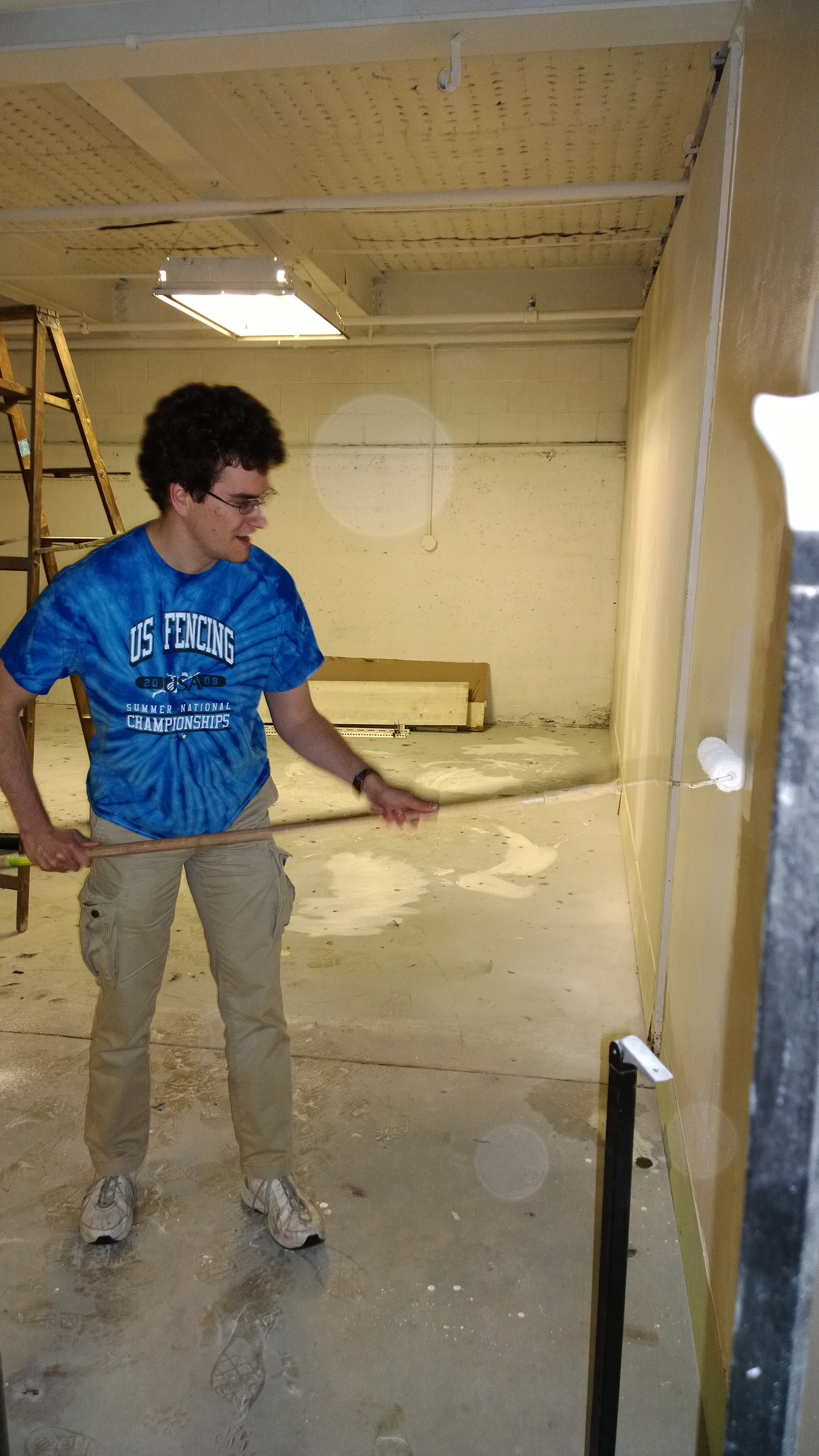 Kevin and Mike rented a paint sprayer and painted the ceiling and themselves on Friday night – 5.5 hours of continuous spraying, plus another couple hours for setup and clean up. On Saturday, Sarah, Kevin, Jules’s boys, Jim and longtime fencing friend Yuly did some touch-up work and painted the rest of the floor. On Sunday, RJ did more touch-up painting and poisoned so those black widow nests don’t come back. That night, Kevin went back and did a second coat of floor paint in the part of the room that will not be covered with rubber floors.