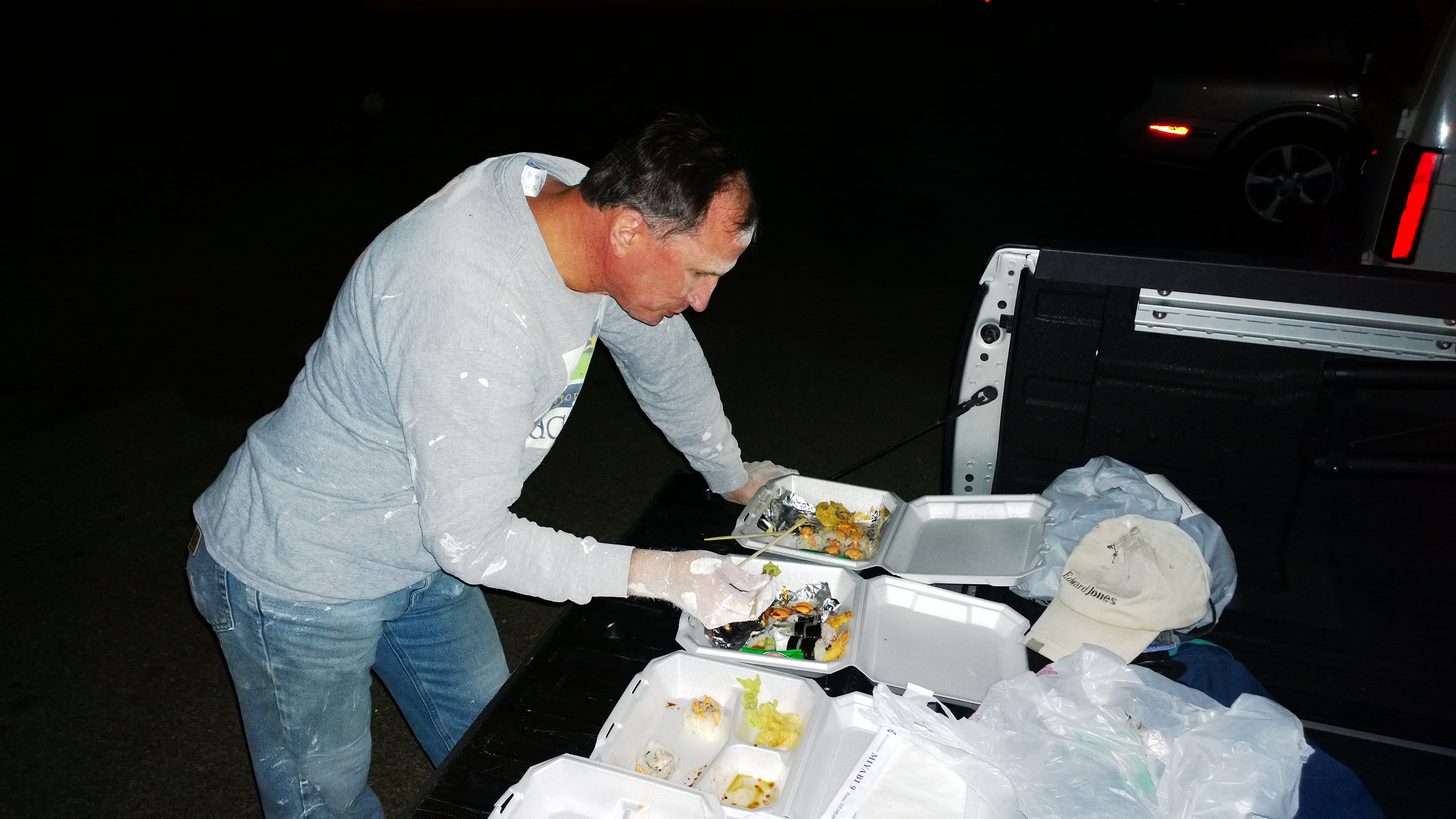 Kevin sprays paint on the ceiling. Now we know what he will look like in 20 years, assuming he still has hair…Mike’s turn on the ladder.Being the only one not covered in paint, Sarah went to nearby restaurant Miyabi 9 and got sushi. We ate it on the tailgate of Mike’s truck since the basement was full of paint.Mike and Kevin took turns spraying paint and eating sushi. Mike found out the hard way that it’s difficult to tell how much wasabi you’re putting on when it’s dark.Yuly paints the back wall.RJ touches up the ceiling paint. It’s kinda like wielding a saber, right?