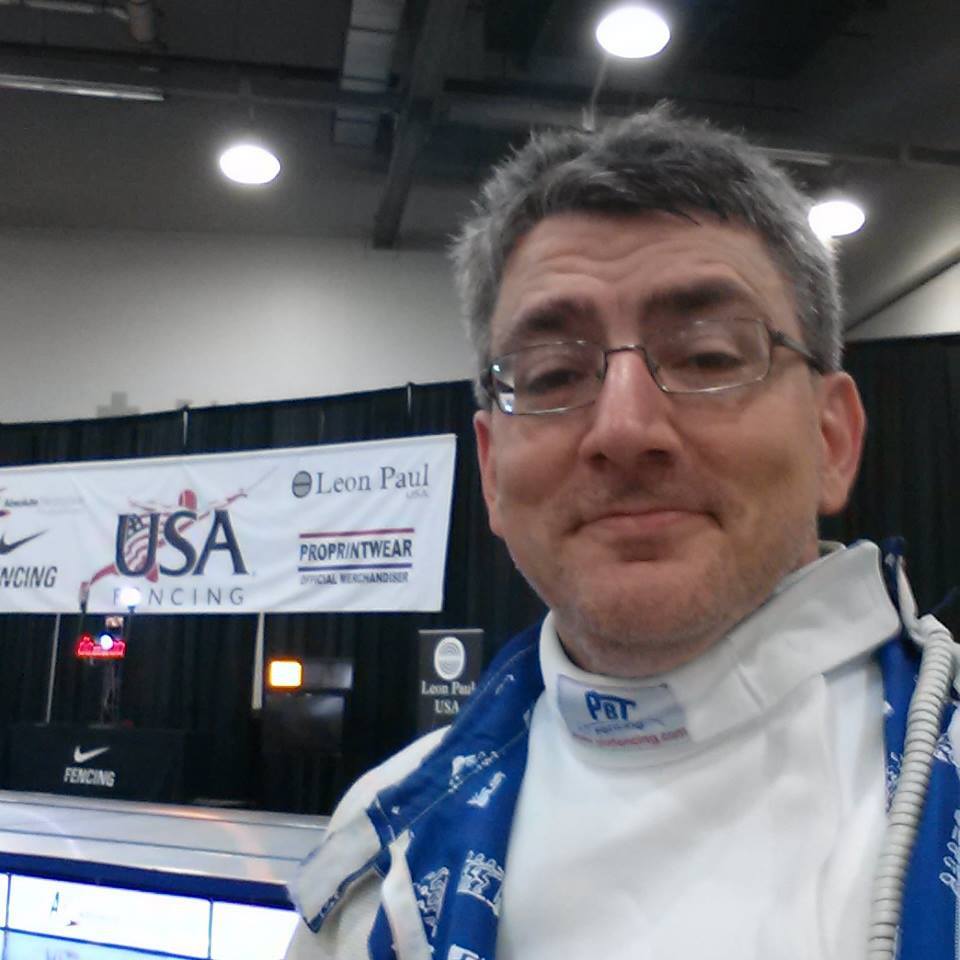 Saber coach RJ Lesch fenced Vet-50 Men’s Saber on Tuesday and placed 19th of 32, missing the round of 16 by only 2 touches. Then on Wednesday, he fenced a tough pool in Division 3 Men’s Saber. In the direct elimination round, he significantly improved his performance against an opponent who had beaten him in pool and ended 98th of 126.